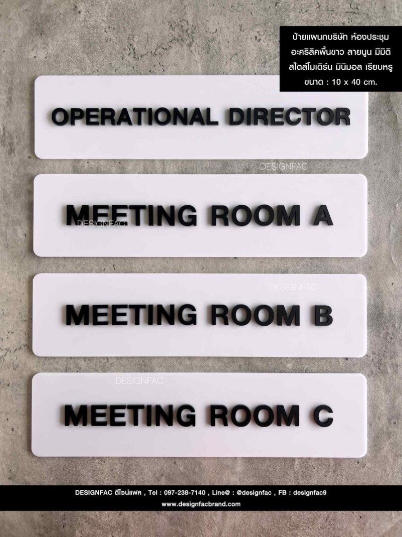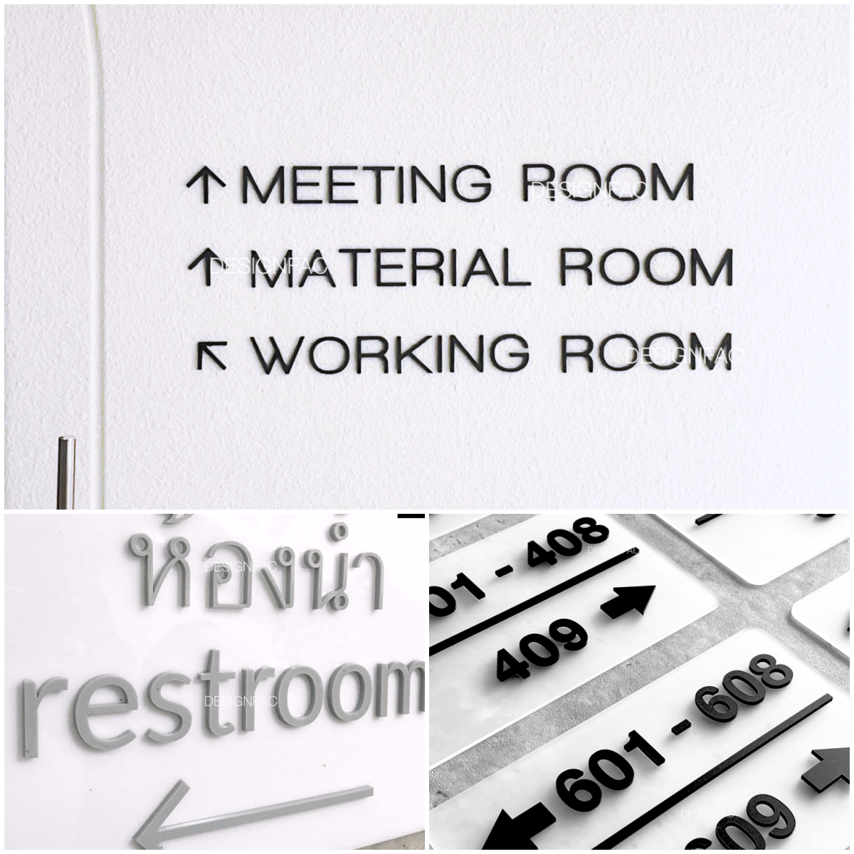 วัสดุแนะนำ: ป้ายสแตนเลส/อะคริลิคสำหรับป้ายประตู, ป้ายเคลื่อนย้าย (moveable signs) สำหรับหน้าห้องประชุมที่เปลี่ยนชื่อ/กิจกรรมบ่อย